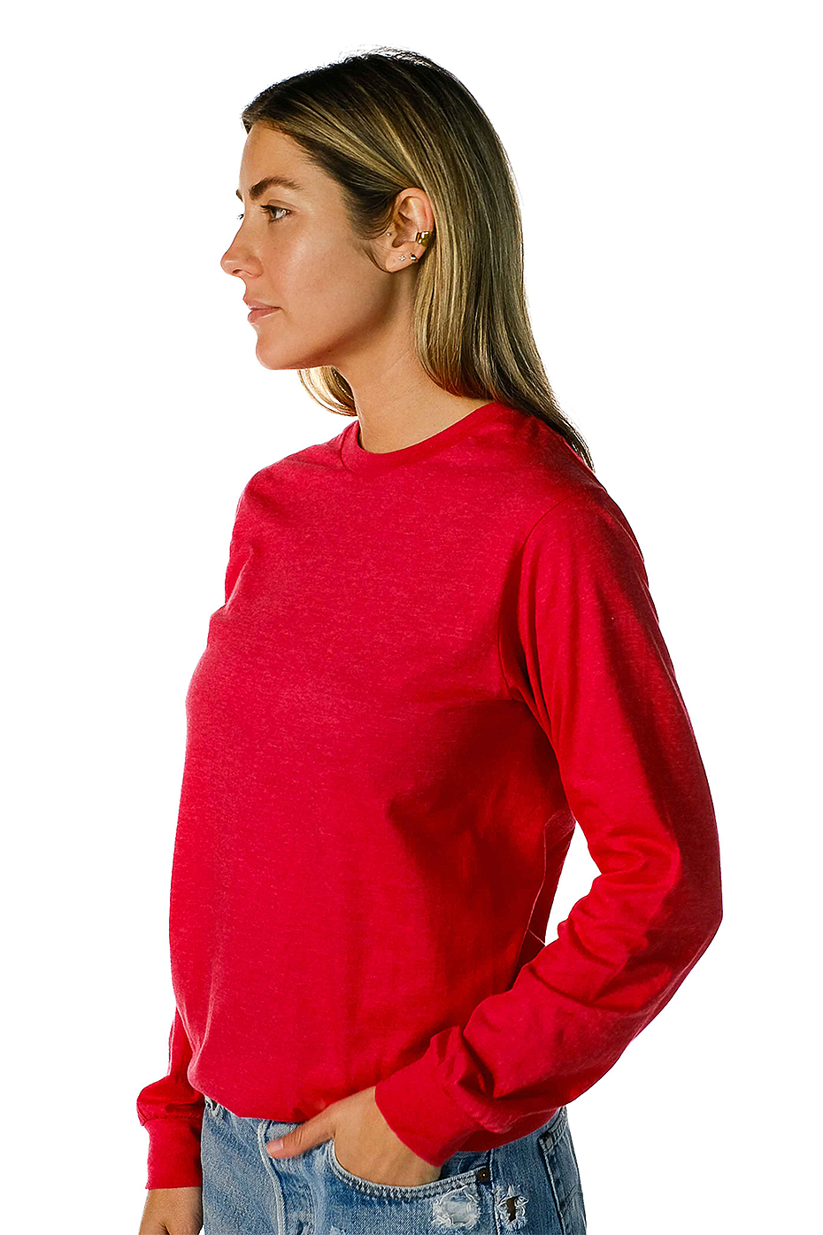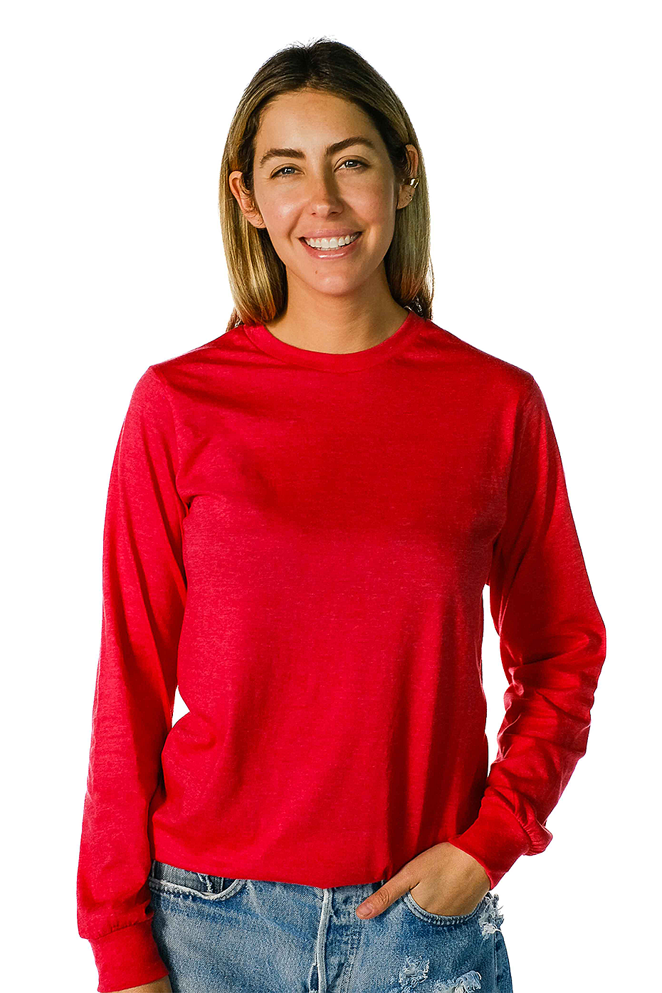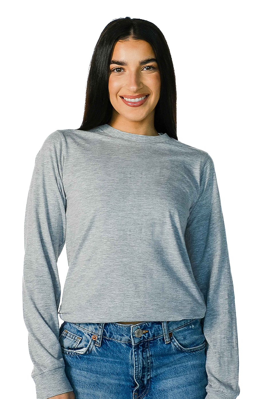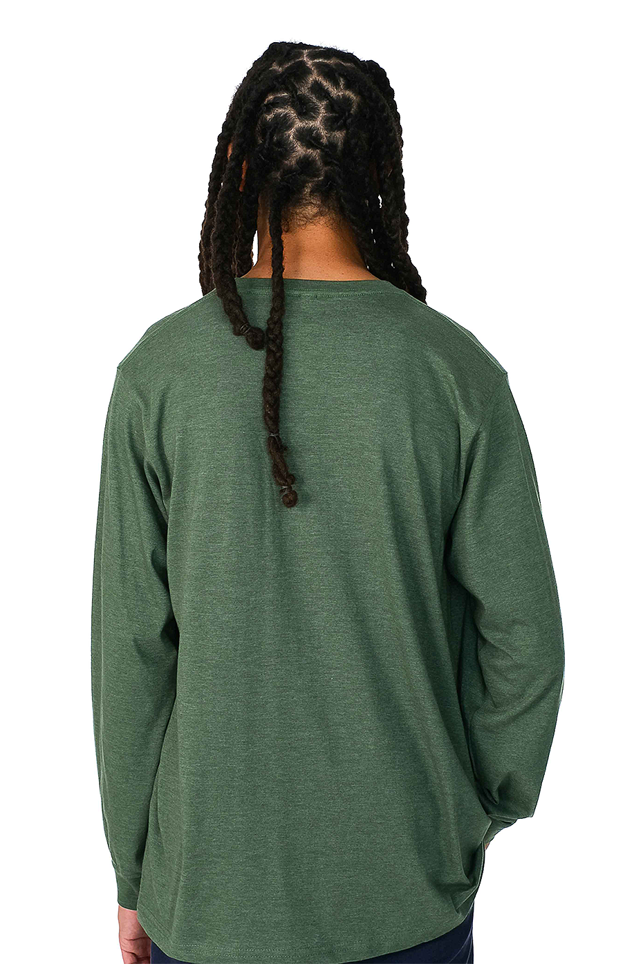 The Premium Heather Long Sleeve Crew Neck Tee is made with 145 GSM / 4.3 OZ premium CVC materials (60% cotton and 40% polyester) for a classy look and soft feel, making it perfect for everyday wear. Features like the ribbed neck and cuff band and double-needle stitching at the hem ensure durability and style. This tee acts as a blank canvas for painting. Available in bulk.
