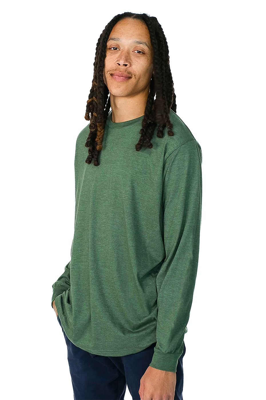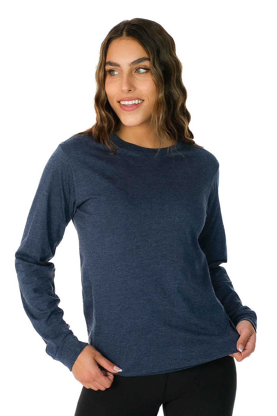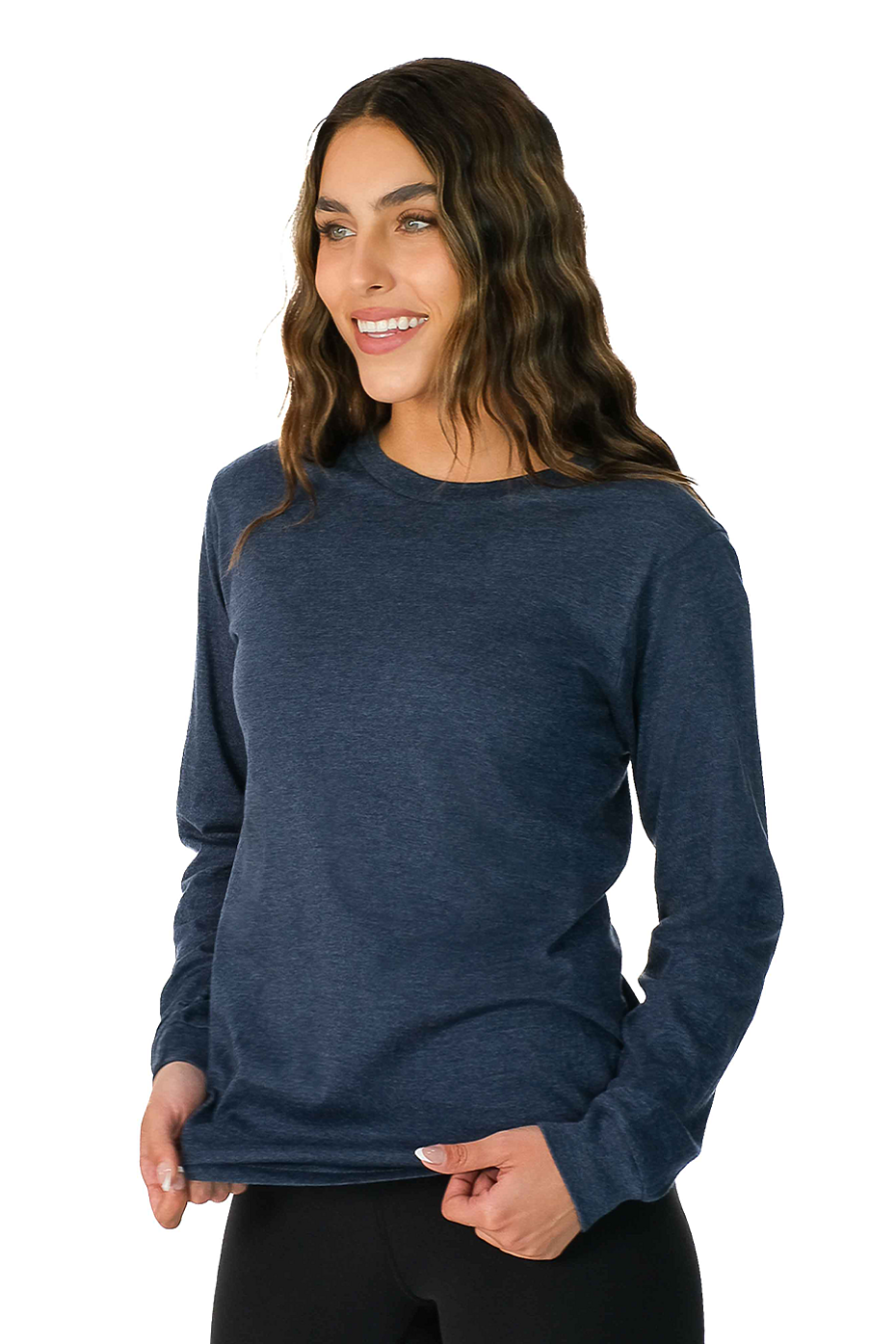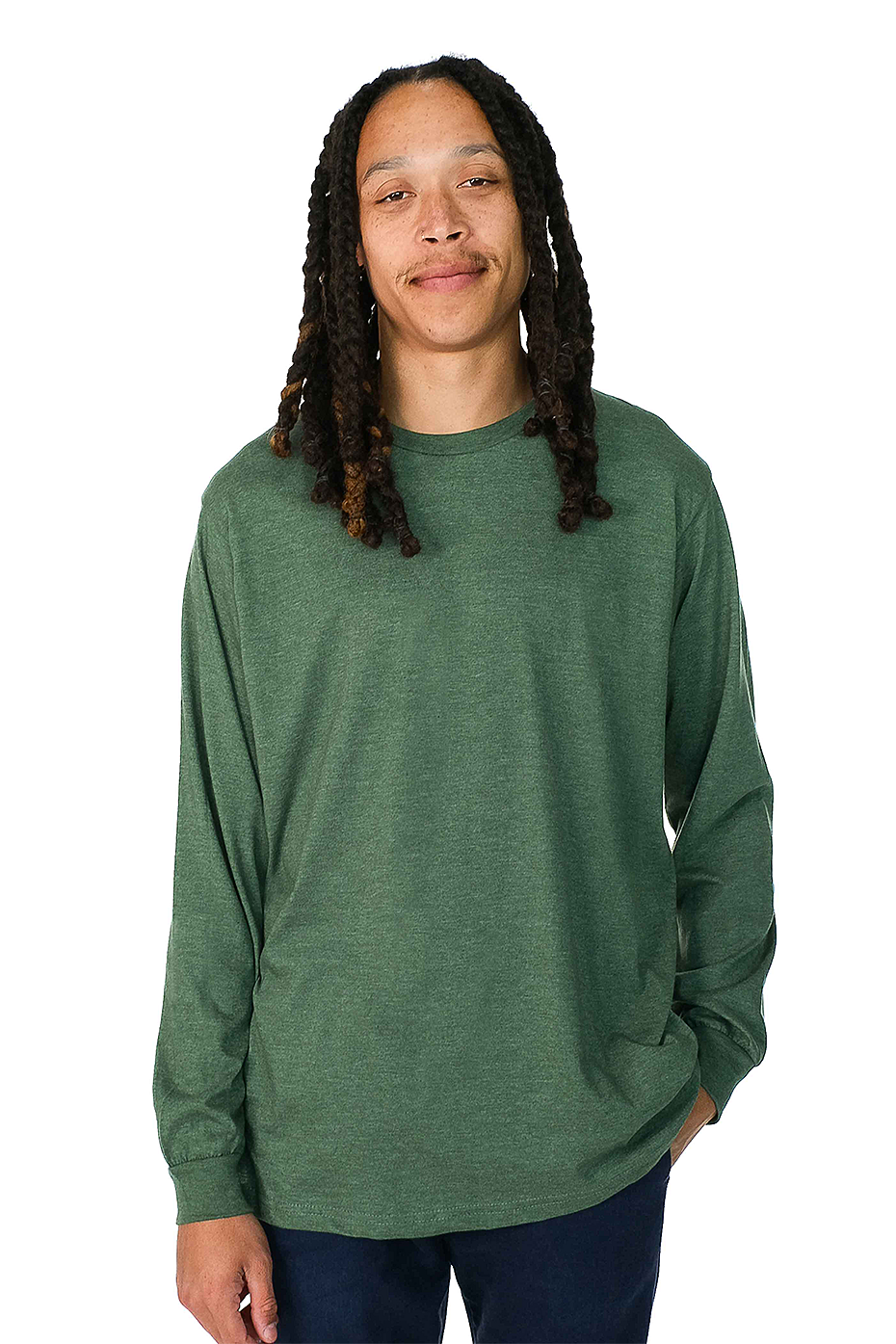 The Premium Heather Long Sleeve Crew Neck Tee is made with 145 GSM / 4.3 OZ premium CVC materials (60% cotton and 40% polyester) for a classy look and soft feel, making it perfect for everyday wear. Features like the ribbed neck and cuff band and double-needle stitching at the hem ensure durability and style. This tee acts as a blank canvas for painting. Available in bulk.